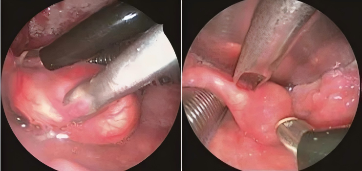 ⑤殘留黏膜剝離:結合喉顯微器械,剝離殘留于囊壁上的黏膜,以最大限度地減少復發(fā)風險。