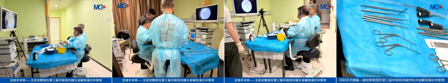 ▲ 王武慶教授、虞幼軍教授在手術(shù)解剖演示中使用美淳的顯微手術(shù)·醫(yī)師椅、耳科手術(shù)器械、灌注泵等設備。